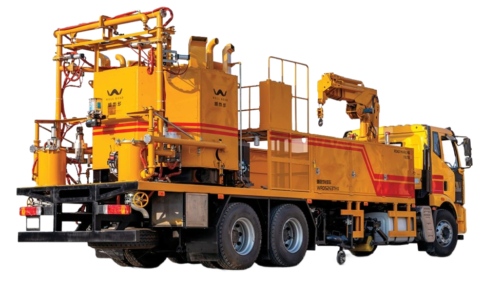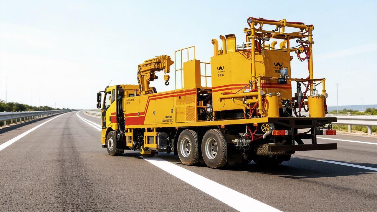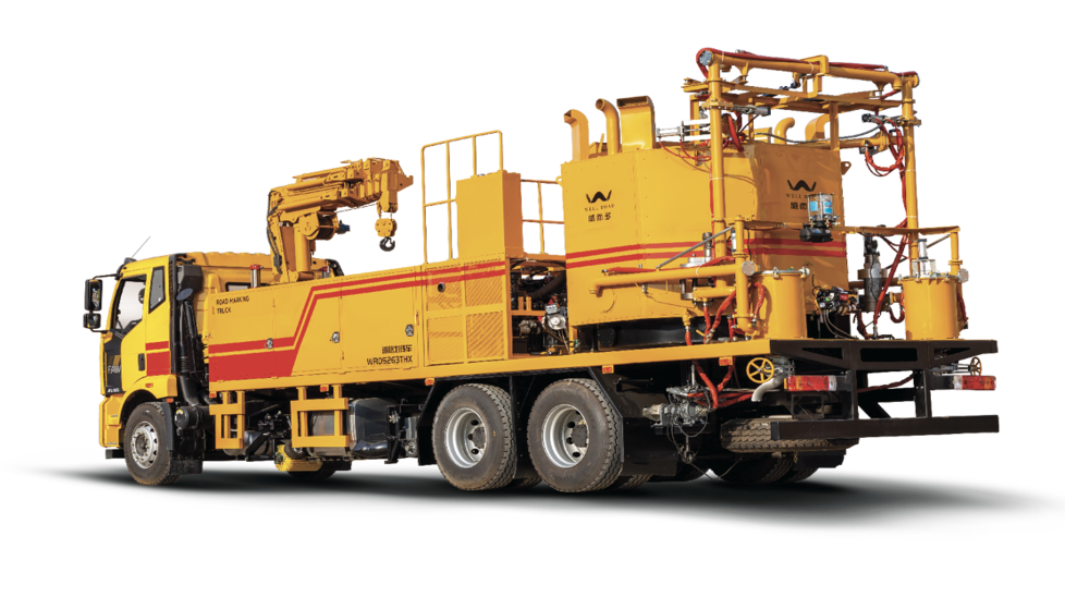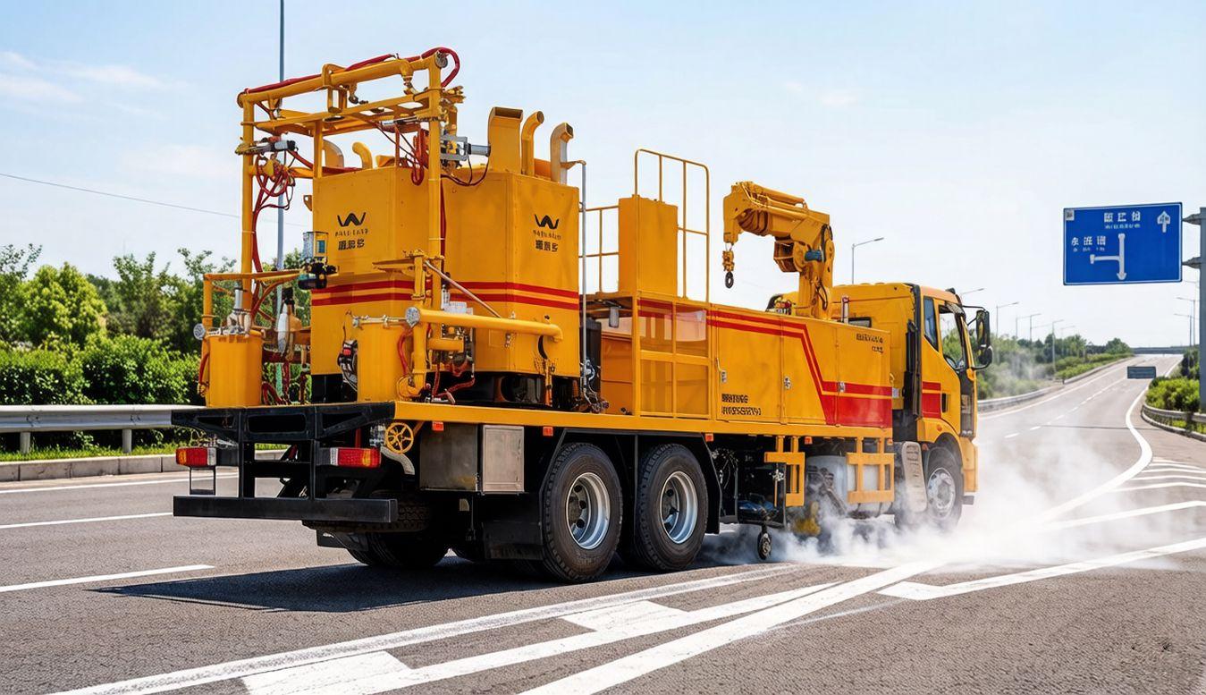 A large yellow line-marking construction vehicle labeled 'WRD5263THX' is efficiently operating beside the highway. In the scene, its large melting pot, on-board crane, and high-pressure spraying system are working together to accurately and efficiently spray molten paint onto the road surface, creating clear traffic markings. The intelligent control system ensures construction precision and efficiency, showcasing a modern, smart road maintenance operation.